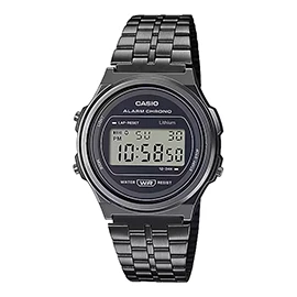 - ساعت کاسیو نوستالژی مردانه: معمولاً با طراحی مشکی، نقرهای یا طلایی و اندازه بزرگتر عرضه میشود.