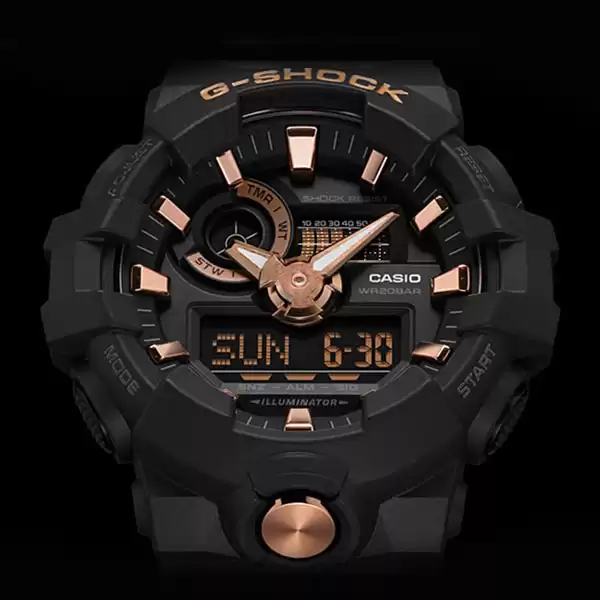 قاب ساعتمچی مردانه جیشاک مدل GA-710B-1A4 از جنس رزین و به رنگ مشکی است . بند این ساعتمچی از جنس رزین و به رنگ مشکی است . همانطور که اشاره شده قاب و بند ساعتهای جیشاک باطراحی منحصربفرد خود در برابر ضربه شدید مقاوماند، البته که گروه جیشاک کاسیو جنس قاب و بند این برند را بگونهای ساختهاند که نزدیکترین مشخصات را به معیارهای اصلی این شرکت یعنی مقاومت و کارایی بالا، داشته باشند . شکل صفحه ساعتمچی مردانه جیشاک مدل GA-710B-1A4 به شکل دیجیتال-عقربهای و به رنگ رزگلد-مشکی است که تمامی قابلیتهای لازم برای شروع یک روز پر هیجان در این صفحه گنجانیده شده است . جیشاک سعی کرده در انتخاب رنگ برای ساعتهای خود به تمامی سلیقه توجه داشته باشد. برخی مدلهای این برند دارای رنگبندی بالایی است که انتخاب را حتی در بین رنگها سخت میکند .